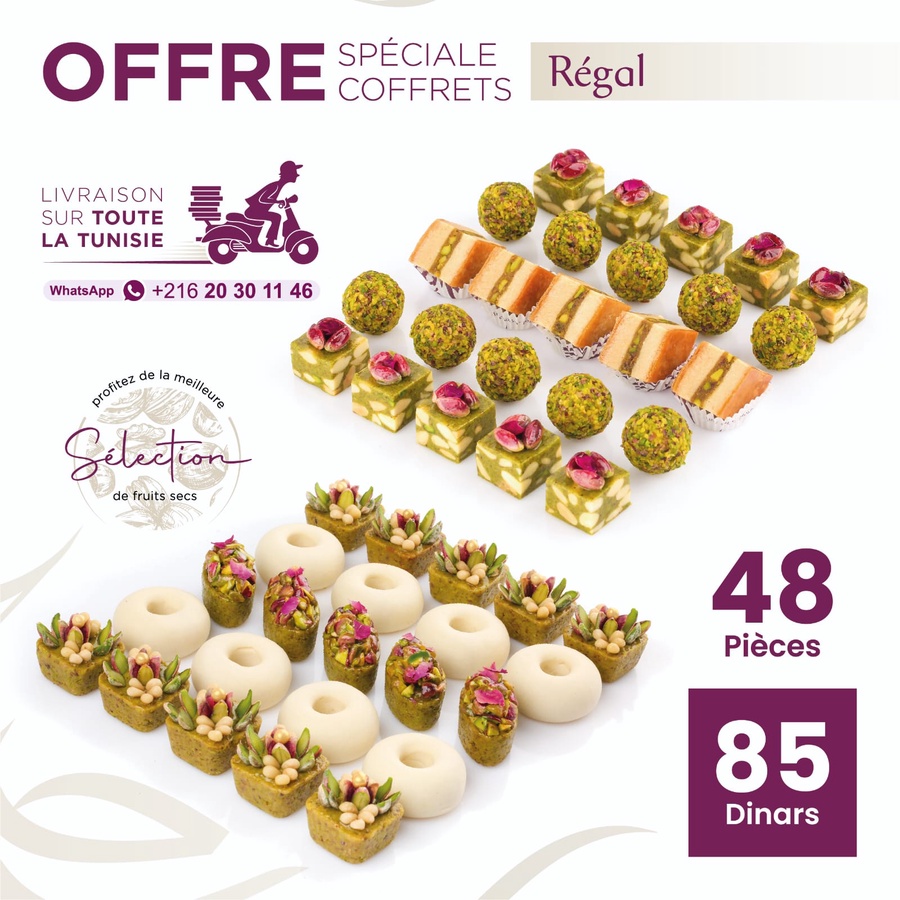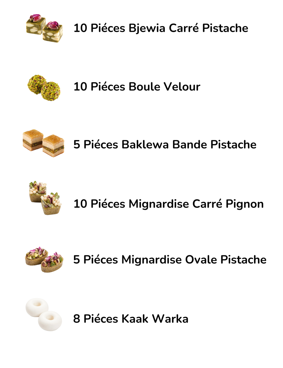, une sélection exquise de pâtisseries tunisiennes raffinées, préparées avec des ingrédients d’exception.